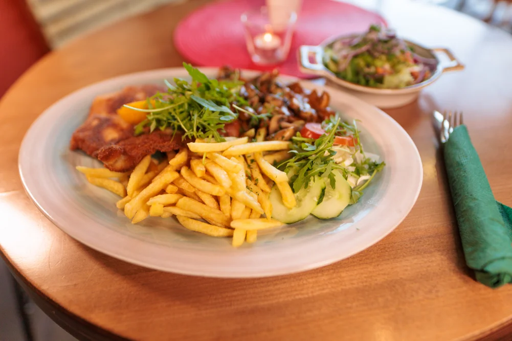 | paniert mit Ananas Käse überbacken und Pommes | 15,90 € |